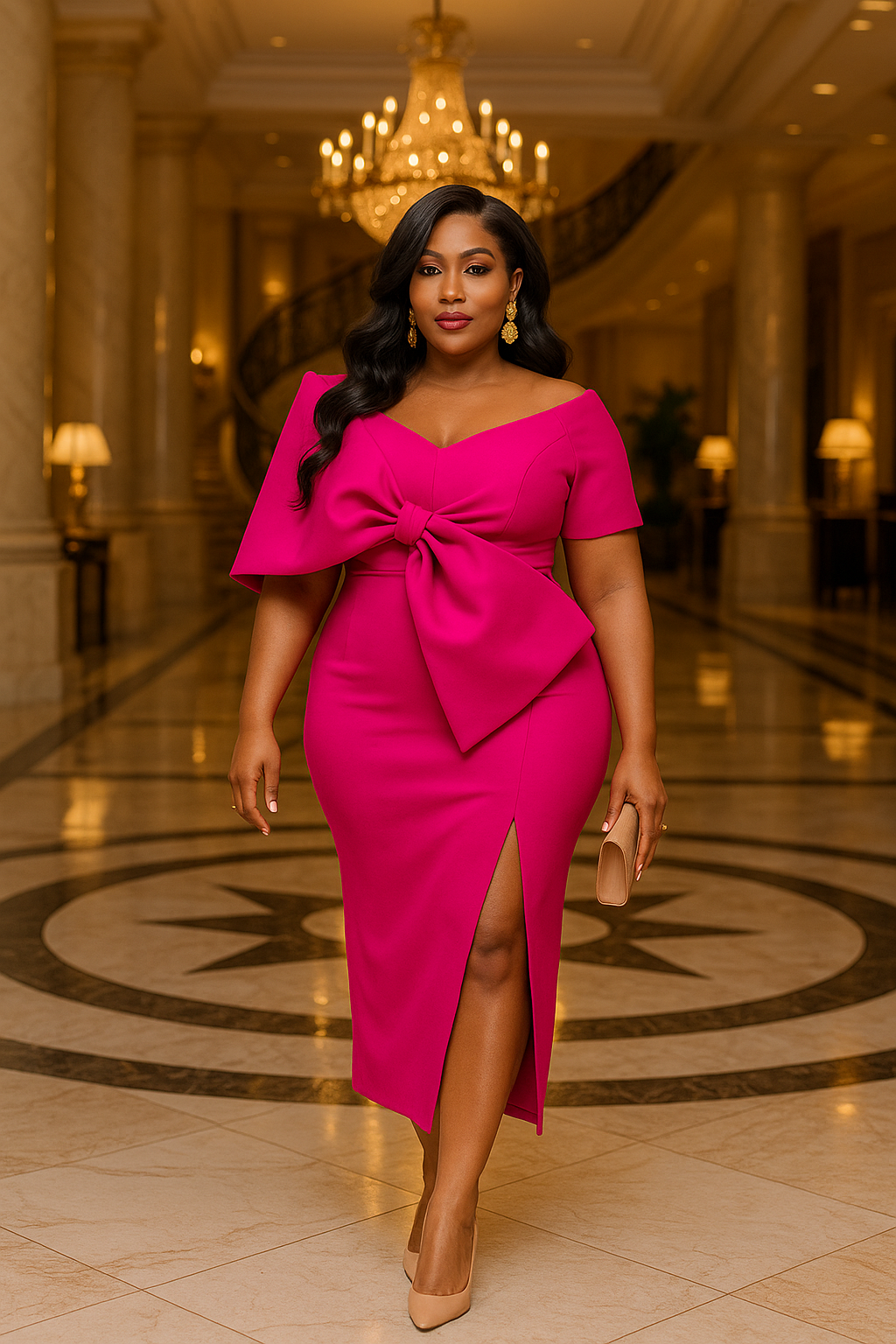 Introducing the Statement Bow Midi Dress – a stunning blend of elegance and modern flair. This exquisite midi-length dress features a dramatic statement bow that adds a touch of grandeur and sophistication. Crafted with a sleek silhouette, it also includes a chic slit that enhances its refined allure. Perfect for making a memorable impression, the Statement Bow Midi Dress effortlessly combines timeless elegance with contemporary style.